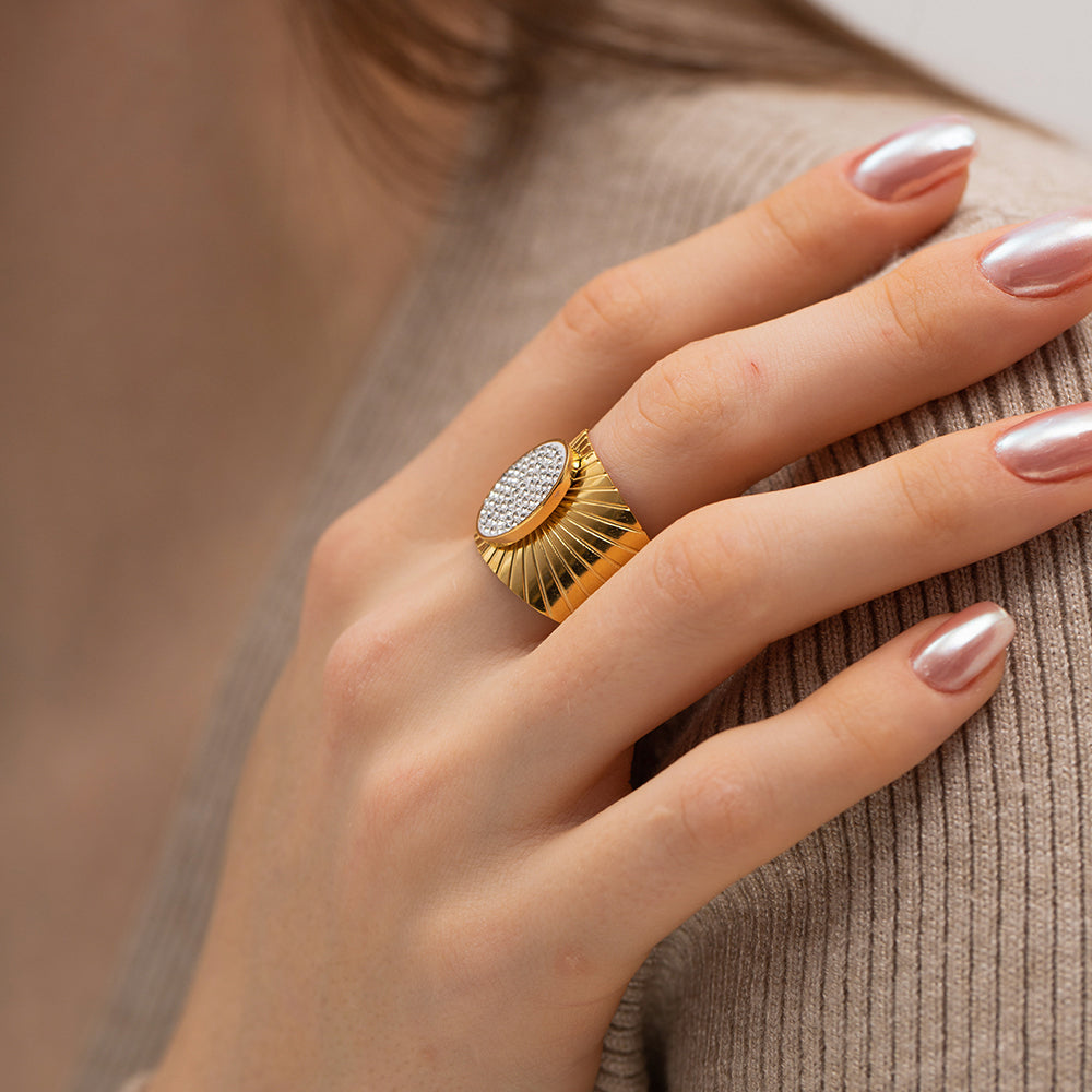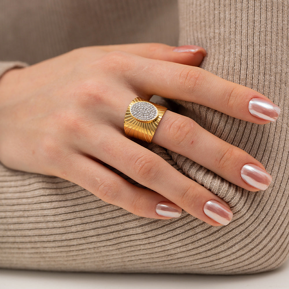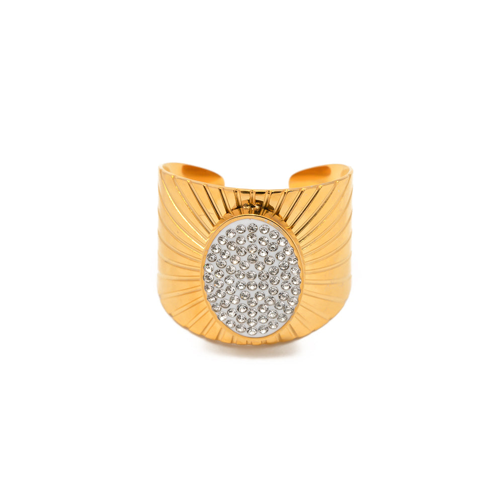 Make a bold statement with this stunning gold-plated ring, designed with sparkling shiny stones at its center. Its luxurious finish and elegant design make it ideal for parties, events, or adding a glamorous touch to your everyday style. A must-have accessory for modern fashion lovers.
